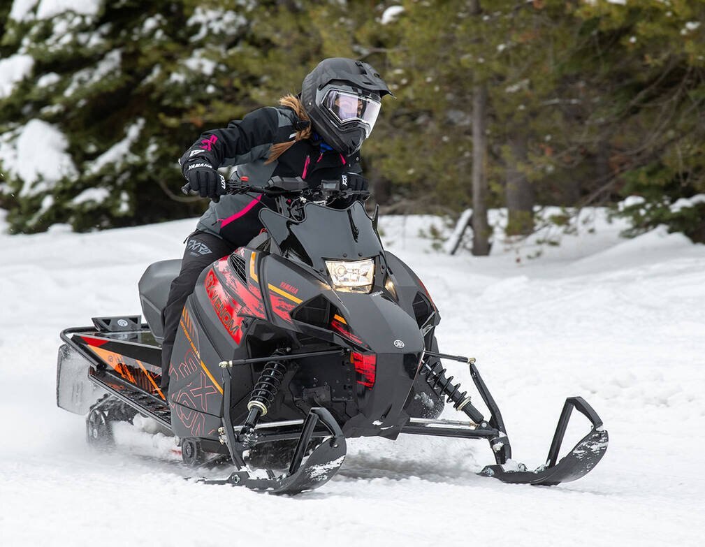 Pulling from Yamaha’s Enticer 340, the SX Venom was engineered with growth in mind. The fuel-injected, electric-start, two-stroke 397-cc single-cylinder engine is propelled by a 121-inch Camso Hacksaw track. Long-travel 'Dual Shock' rear suspension, lightweight alloy chassis, Stryke single-keel skis and racy styling are combined in a lightweight sled that’s perfect for anyone in the family to go for a rip! It’s guaranteed fun for young, new AND returning riders.